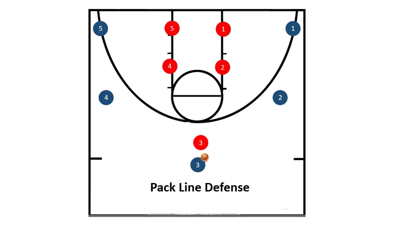 The ‘Pack Line’ defense is a variation of man-to-man defense developed by Dick Bennett for the Washington State University Cougars. The biggest difference between the two is that instead of the off-ball defenders being out pressuring their player and denying the pass, everyone except the player guarding the ball must be inside an imaginary line 16 feet from the rim. This 16ft line is known as the pack line.