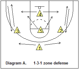1-3-1 Zone is probably the most versatile zone defense since it is very favorable and conducive to matching up and trapping. In fact, its basic form is the least use. While most zones matchup to the ball, in the 1-3-1 zone, defenders play off and overplay the passing lanes. In playing the passing lanes, it spreads the offense and forces the offense to throw over the defense or extended cross court passes which are vulnerable to interceptions and deflections.