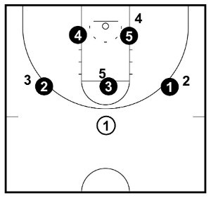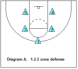 The 1-2-2 Zone Defense would have to be one of the most commonly seen defensive formations within the zone category. The 1-2-2 Zone Defense provides very strong interior defense around the keyway. For this reason, the defense also provides a good initial situation for strong rebounding coverage.