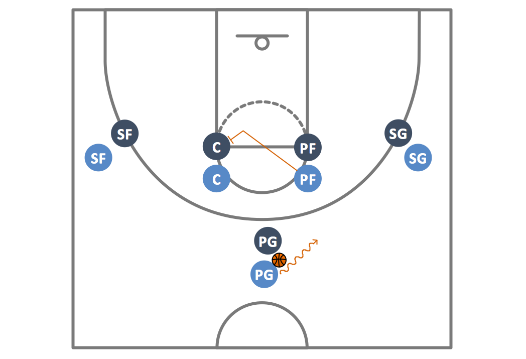 This defense protects the interior versus strong post players, ensures good corner coverage, and often results in excellent rebounding position.