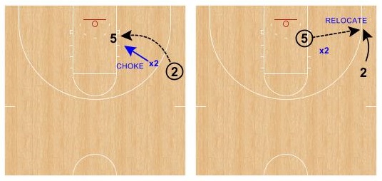 To “choke” the post, Pack Line defenses use strong-side perimeter defenders to stunt at the post upon entry. The goal is to shrink or “choke” his/her space.